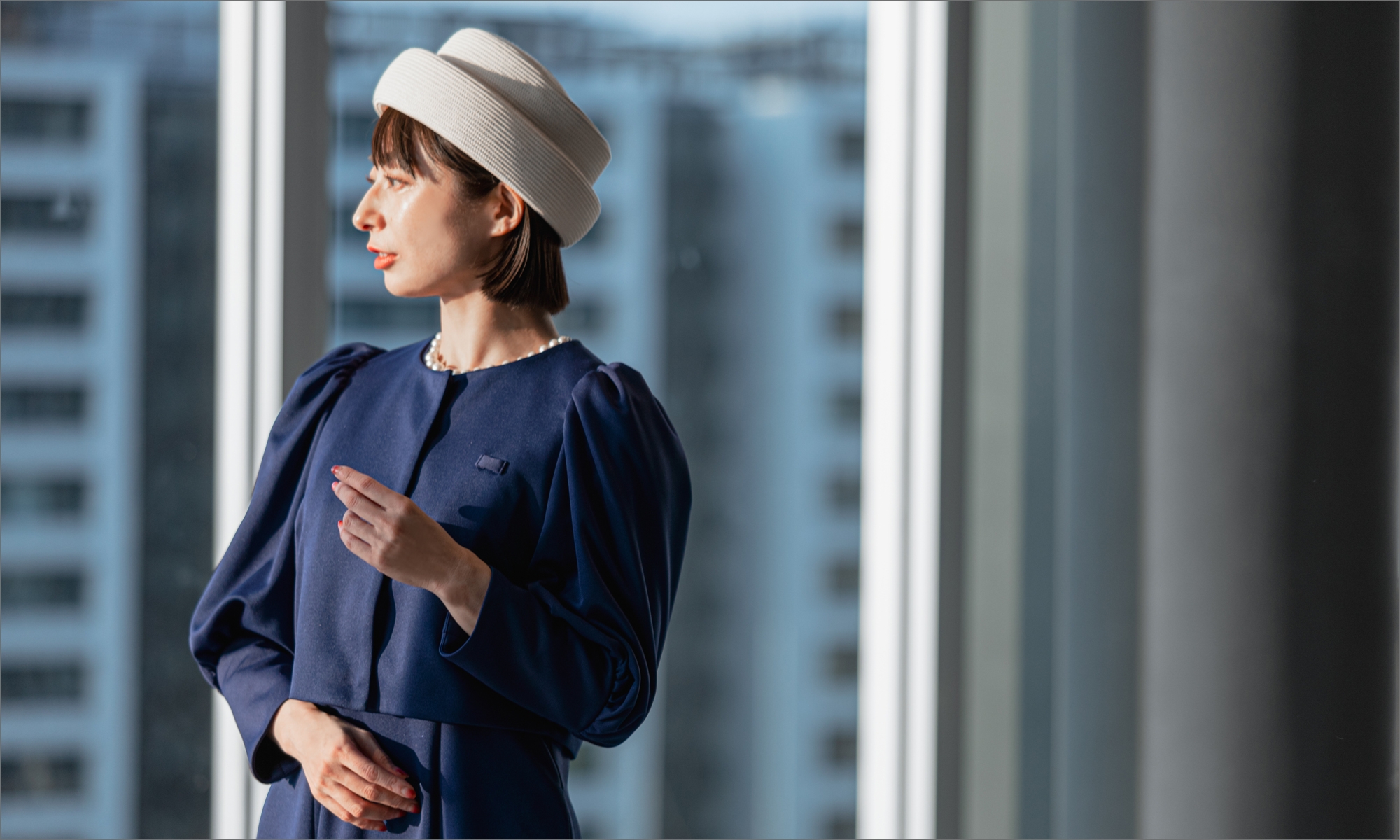 胸元にパールを襟元のパールは取り外しができ、ジャケットの袖口にはボタンをあしらったファッション性の高いデザイン。渋谷ヒカリエが2022年に開業10周年を迎えたため、袖口のボタンの数は10個にしています。その日の気分でジャケットを脱ぎ着して、雰囲気の違うユニフォームをお楽しみいただけます。